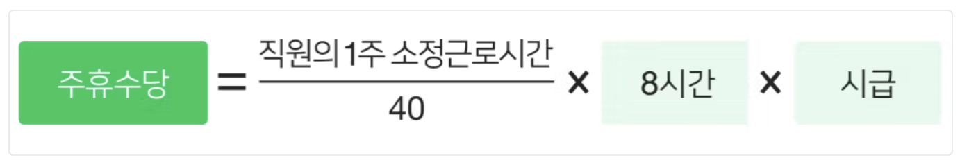 - 주휴수당 = (1주 소정근로시간 ÷ 근무일수) × 시급