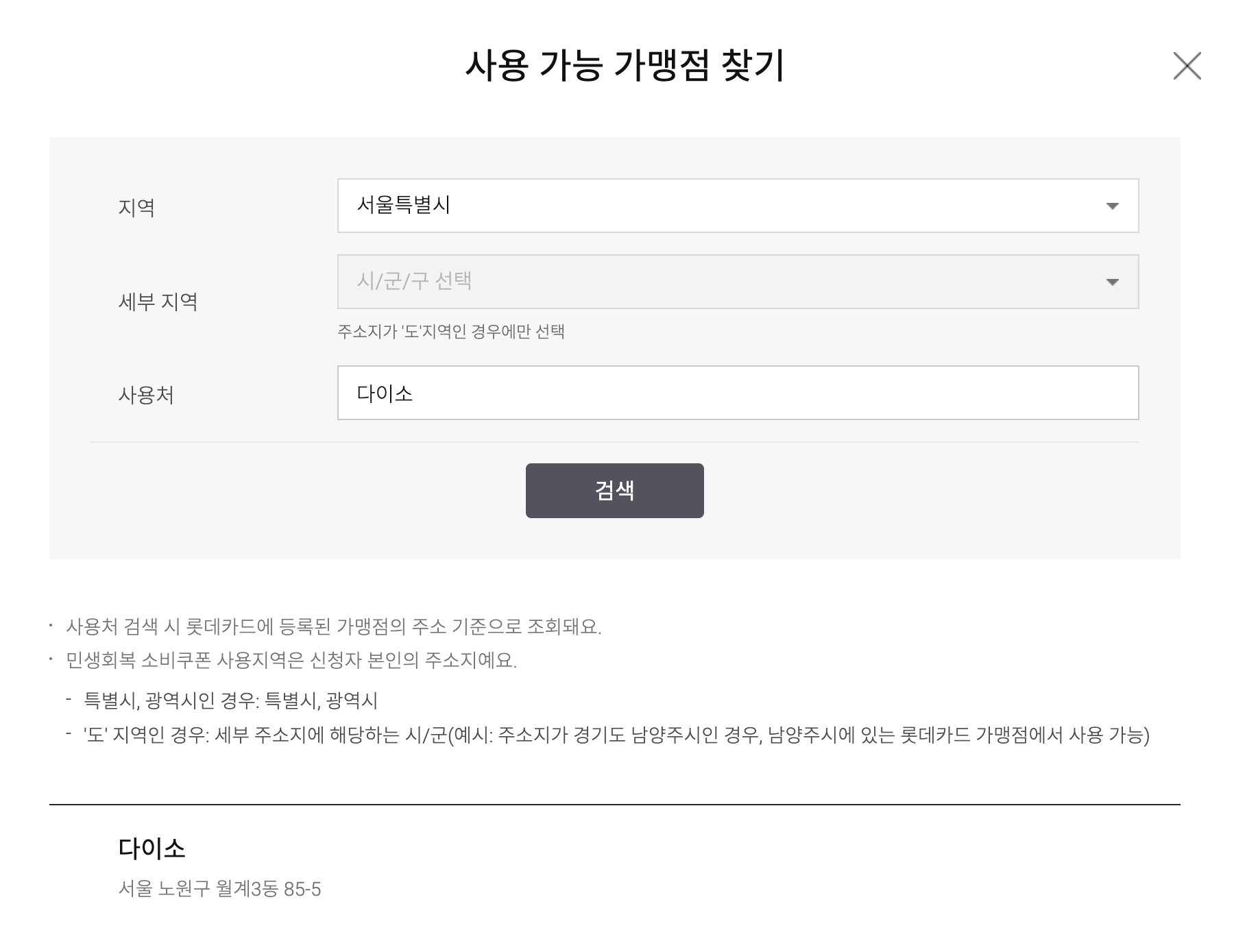 (롯데카드 홈페이지 내 검색 서비스지만, 모든 카드사 공통 가맹점 정보 제공)