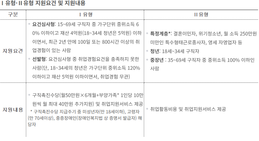 👉 정리하면, 경제적 여건이 더 어려운 분들은 Ⅰ유형(현금 지원+취업지원), 상대적으로 덜 어려운 분들은 Ⅱ유형(서비스+활동비 지원)을 받게 되는 구조입니다.